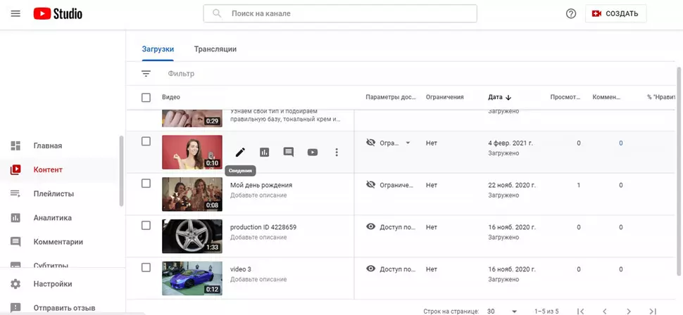 2. Когда сайт полностью обработает добавленный клип, перейдите в раздел «Контент». Найдите нужное видео и кликните иконку в виде карандаша.