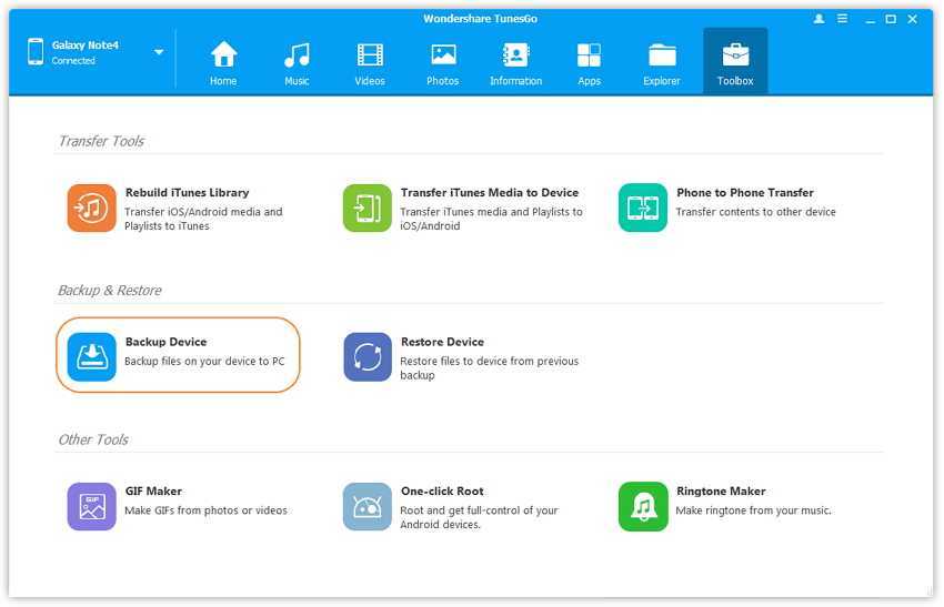 Нажмите «Восстановить устройство» на основной интерфейс программы. TunesGo может поддерживать резервные копии, созданные другими мобильные менеджеры тоже, такие как MobileGo, Samsung kies , iCloud и iTunes, и др. Выберите файл резервной копии, которую вы хотите восстановить из списка.