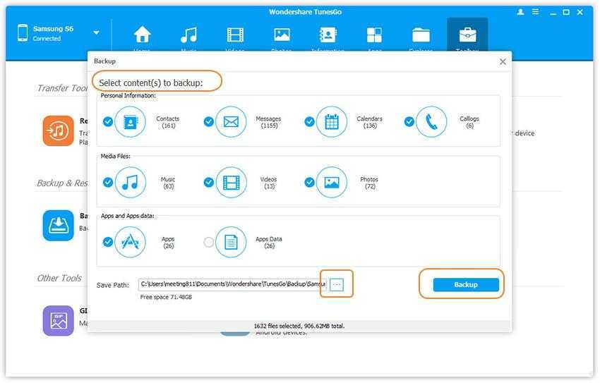Нажмите кнопку «Устройство резервного копирования» и выберите файлы, которые вы хотите создать резервную копию вашего Android к компьютеру, а затем нажмите кнопку «Backup», чтобы начать резервное копирование данных.