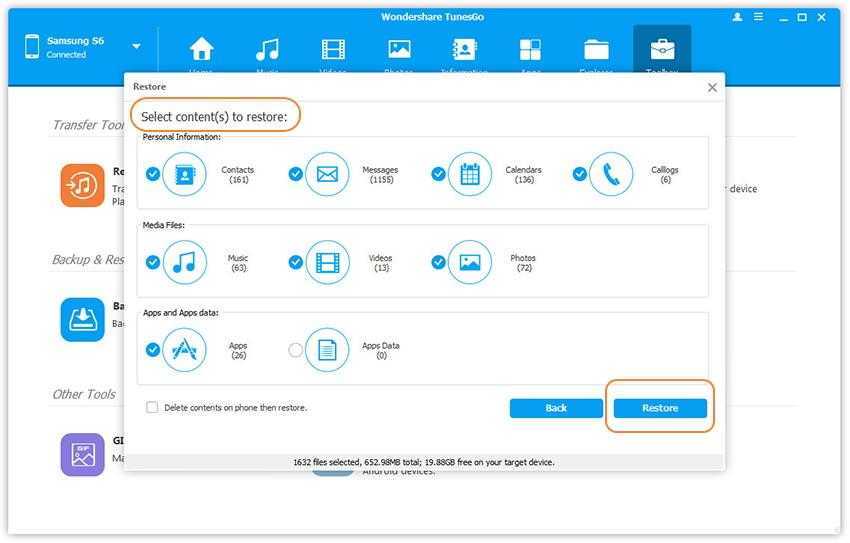 Теперь будут перечислены данные из файла резервной копии, который может быть передан на окна, такие как контакты, сообщения, фотографии, callogs, приложения и др. Можно выбрать данные, необходимые для передачи нажмите кнопку «Восстановить». Выбранные данные будут полностью восстановлены на ваш телефон.