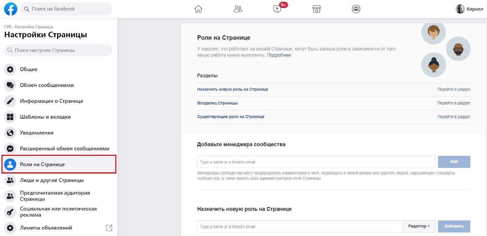 Далее открыть «Роли на странице». Здесь можно добавить менеджера сообщества и управлять ролями.