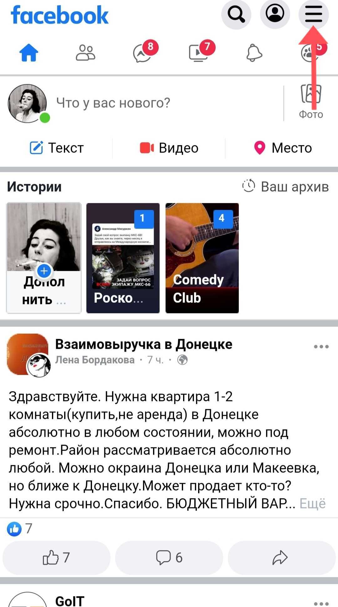Необходимо войти на сайт с помощью мобильного приложения Facebook, авторизоваться и нажать на кнопку с изображением трех горизонтальных линий — она расположена в верхнем правом углу.