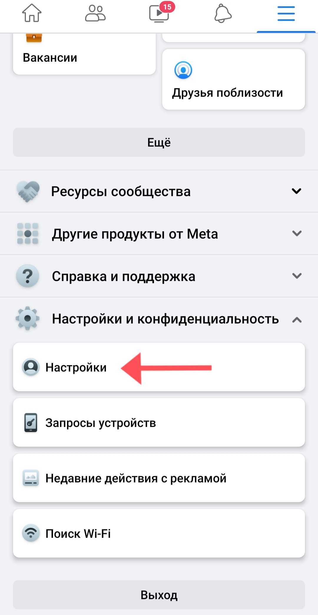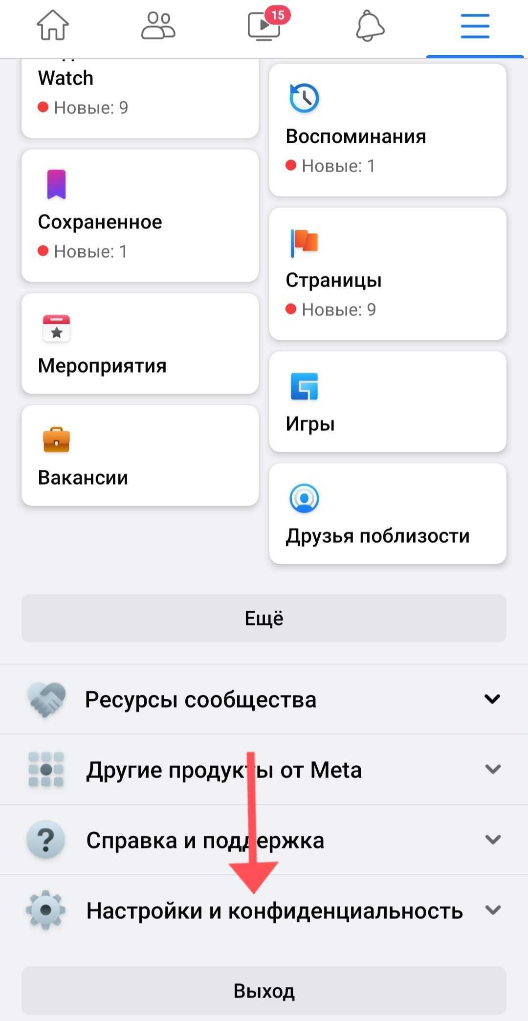 В открывшемся окне выберите пункт «Настройки и конфиденциальность». Экран необходимо пролистать вниз — в верхней части этот раздел не отображается.