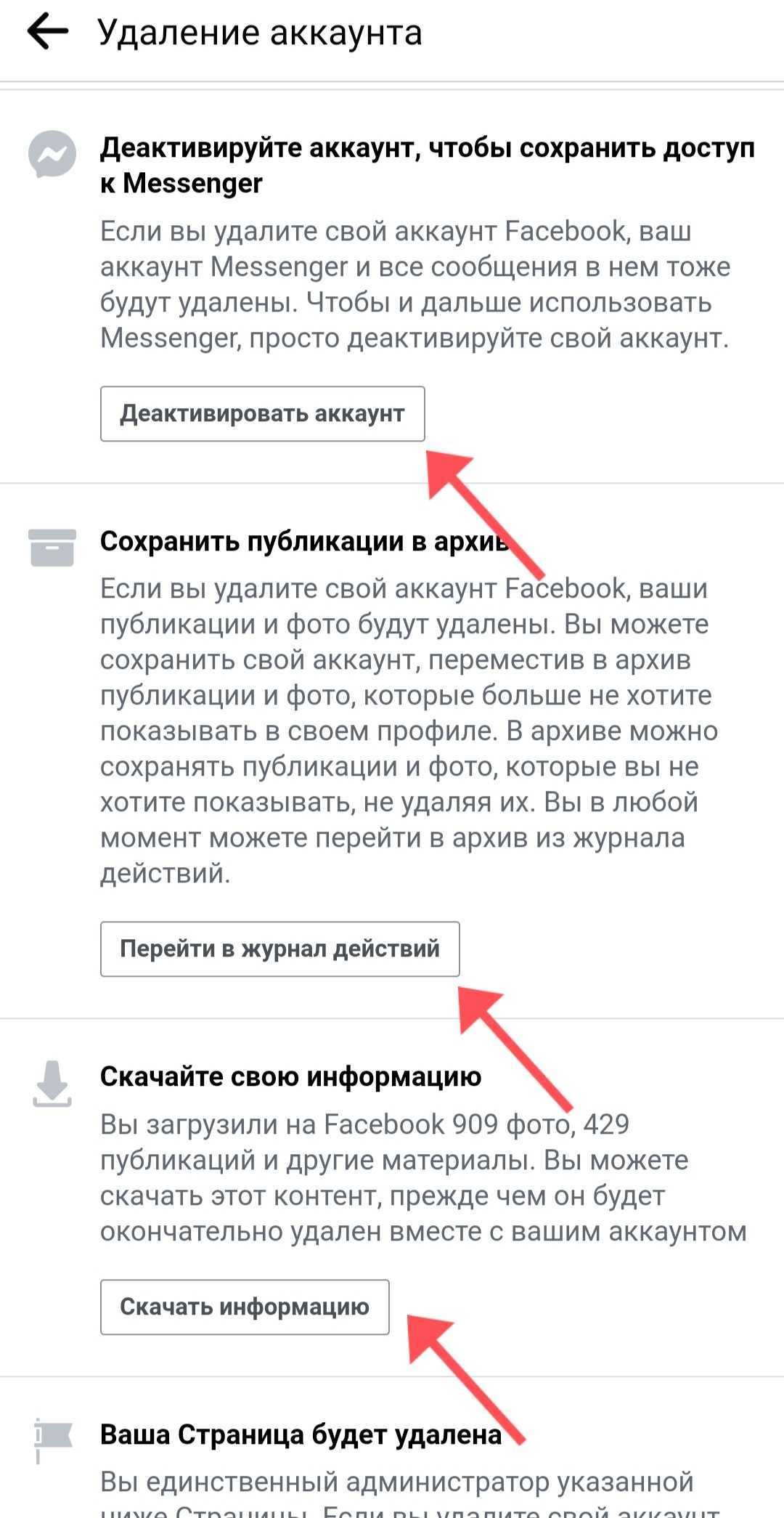 Фейсбук попытается «отговорить вас» от ухода с сайта, предлагая временную деактивацию и анализ всех действий на платформе. Кроме того, есть возможность сохранения публикаций в архив и так далее.