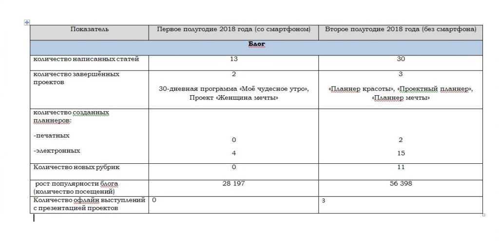 По итогам эксперимента я сделалатаблицу сравнения моей продуктивности в цифрах за два моих полугодия – я сравнила личную эффективность и результаты моей работы” за первое полугодие, когда у меня ещё был смартфон, и за второе, когда я практиковала жизнь без смартфона..