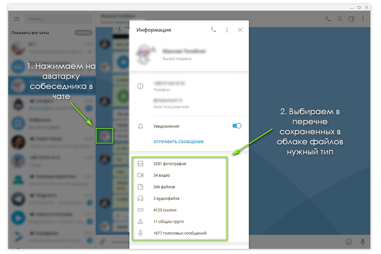 Для владельцев ПК такой же алгоритм применяется к пользователям мобильной версии Telegram. А трудности заключаются в разработке интерфейса приложения. На компьютере для просмотра файлов, сохраненных в облаке, необходимо нажать на аватар человека, с которым велась переписка, и выбрать «Фото», «Видео» или «Аудиофайл» в зависимости от формата запрашиваемой информации.