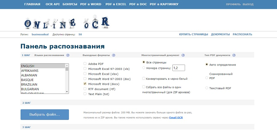 На этом сервисе пользователи могут провести распознавание текста бесплатно и сохранить результат в редактируемые текстовые файлы без установки софта. Поддерживается работа со сканами, популярными форматами графики, сканами и PDF. Без регистрации и оплаты доступно распознование только 15 страниц в час. После авторизации данный лимит повышается до 50, а также увеличивается допустимый размер (200 МБ).