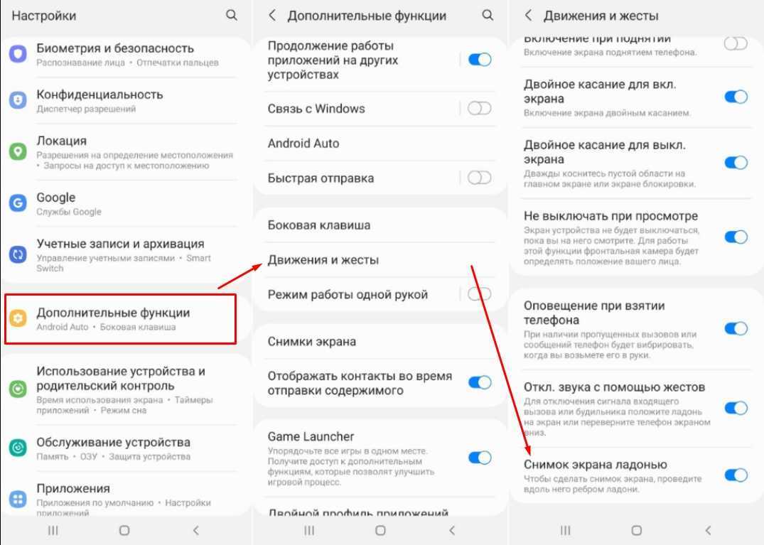 - Активируйте функцию, перейдя в «Настройки» — «Дополнительные функции» — «Снимок экрана ладонью».