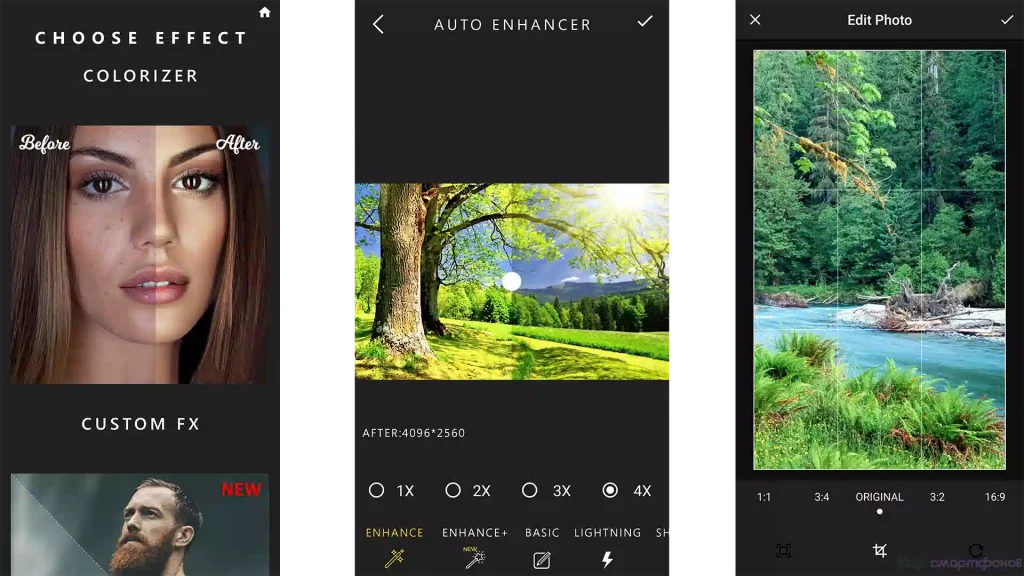 Продвинутое приложение для улучшения качества фото на Андроид предлагает широкий набор инструментов для преображения имеющегося снимка. Любое изображение получится превратить в привлекательное. Если оно размыто, то можно сделать фото четким. А имеющиеся дефекты легко удастся скрыть. Также приложение позволяет воспользоваться любым из доступных фильтров или инструментов. Фотографию получится скорректировать ручными настройками по основным параметрам, улучшить качество автоматически, нанести нестандартные эффекты, добавить текст или даже скорректировать фигуру человека на снимке. Вы сможете также установить на фото подходящие рамки или задать фокус на отдельных деталях.