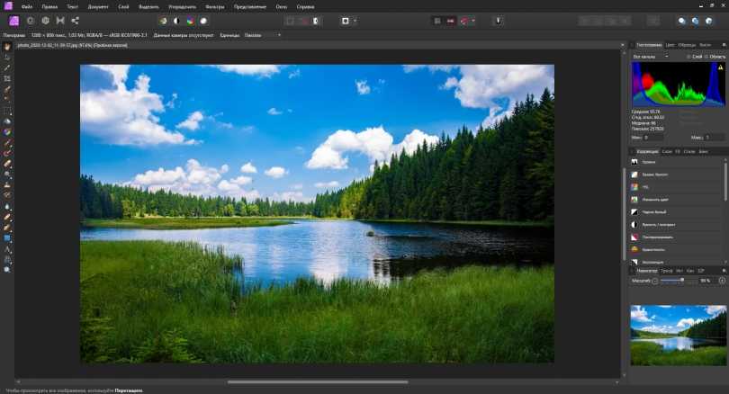 Функциональность редактора Affinity Photo подойдет продвинутым пользователям,а вот новичкам наверняка покажется сложной. Эта программа выносит редактирование изображений на профессиональный уровень: цветокоррекцию, работу со слоями, фильтрами и кривыми. Affinity Photo предлагает полный набор инструментов для работы с файлами RAW: коррекцию искажений объектива, удаление битых пикселей, корректировку дисторсий, цветокоррекцию и многое другое. Отдельно стоит отметить работу с метаданными файлов: вы сможете их изменить или прописать.