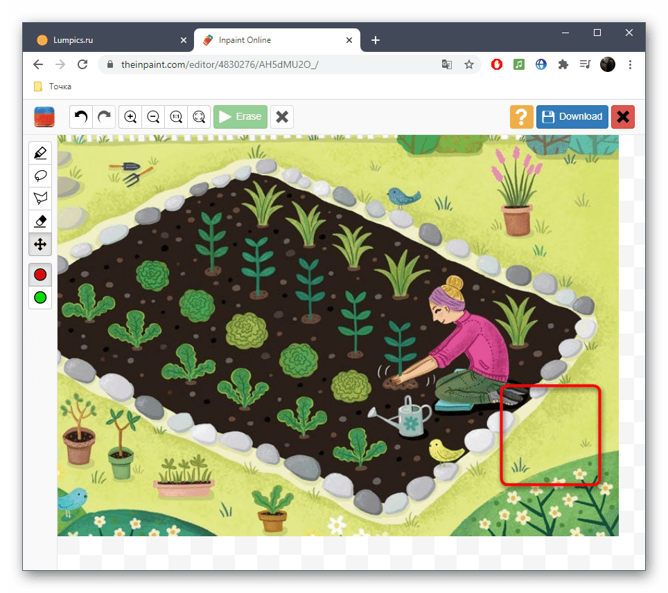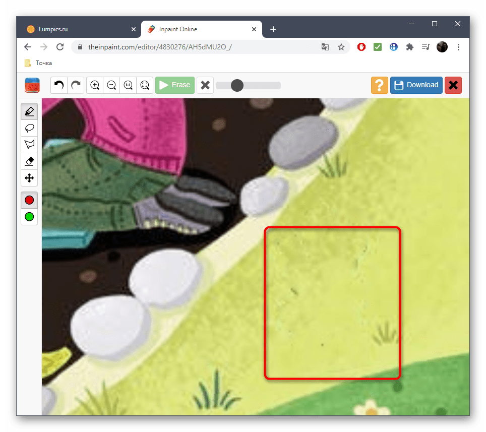 Теперь нам нужна «Заплатка». Ее можно найти в том же разделе «Ретушь». Принцип работы аналогичен одноименному инструменту из Фотошопа. Обведите объект мышью, после чего переместите выделение на то место, которым хотите заполнить объект.
