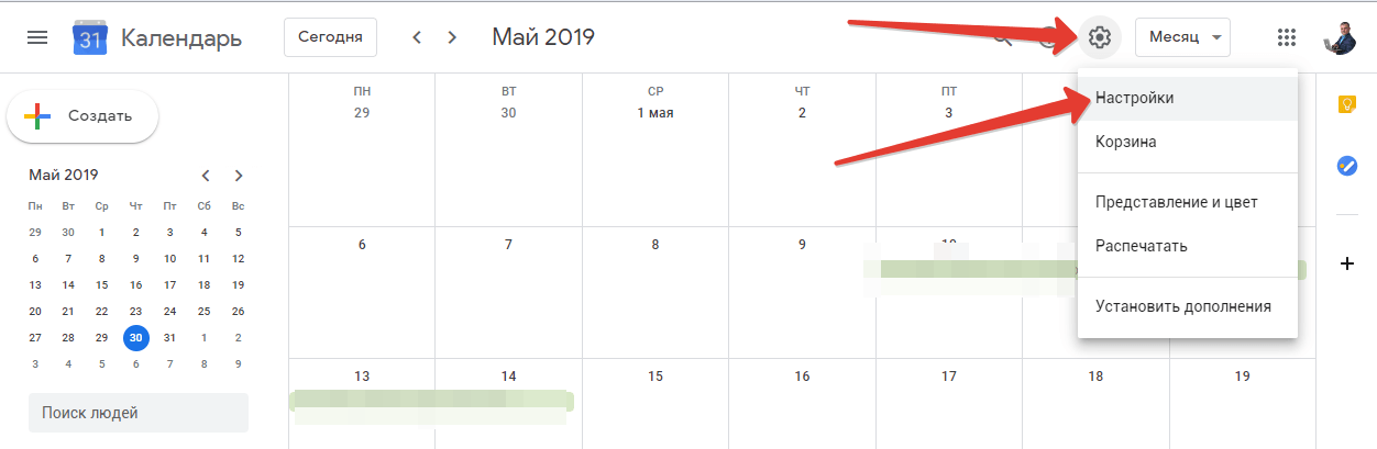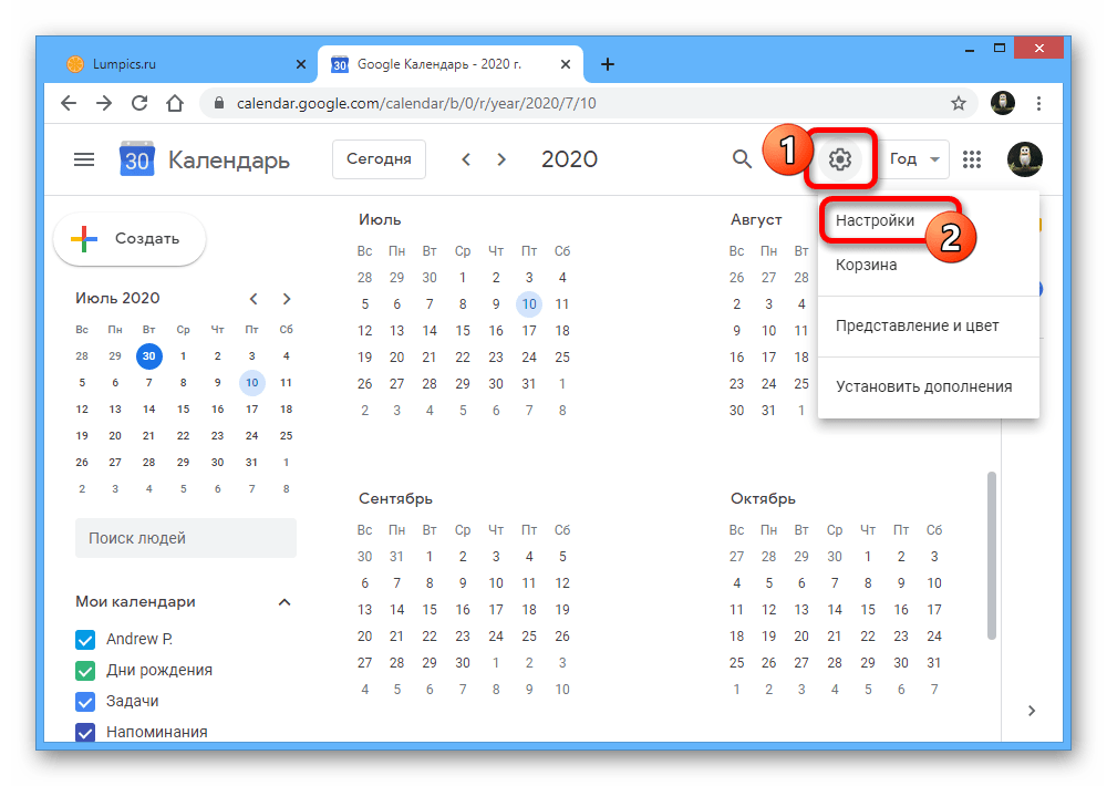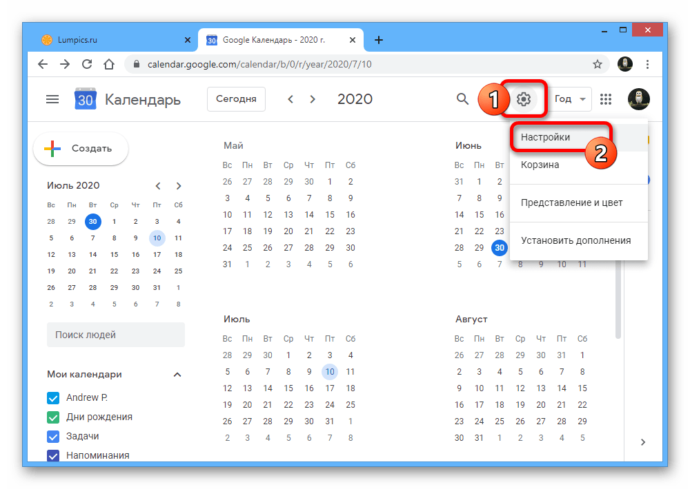 - Находясь на главной странице Google Calendar, щелкните ЛКМ по значку с шестеренкой на верхней панели и выберите «Настройки».