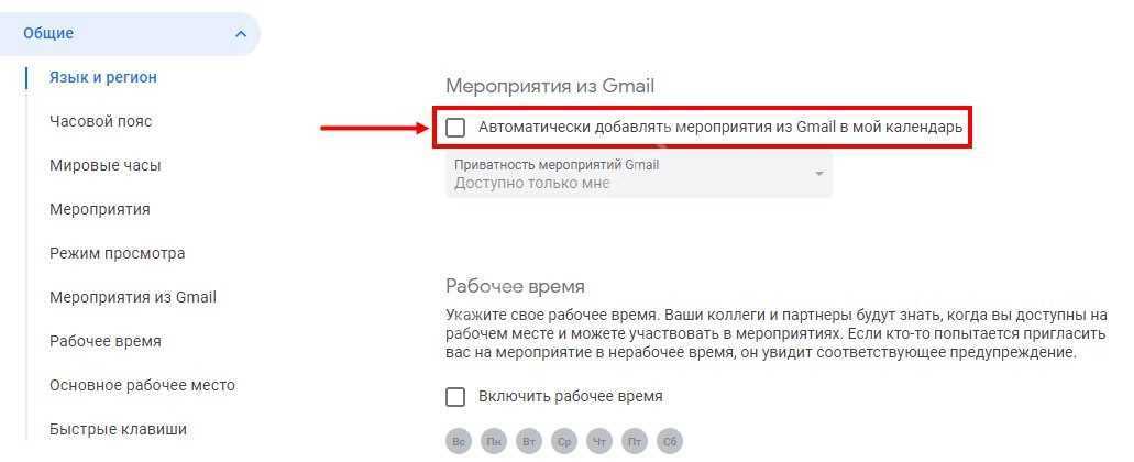 Разверните список «Общие» в левой колонке «Настроек» и перейдите на вкладку «Мероприятия из Gmail».