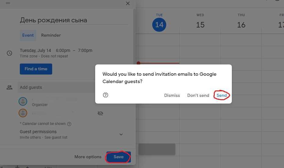 - Чтобы позволить корректировать мероприятие другим пользователям, в разделе с разрешениями для гостей следует поставить нужные флажки.