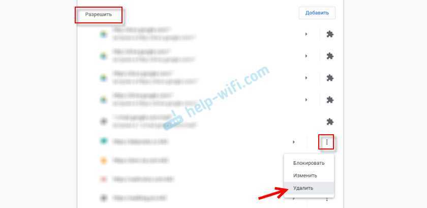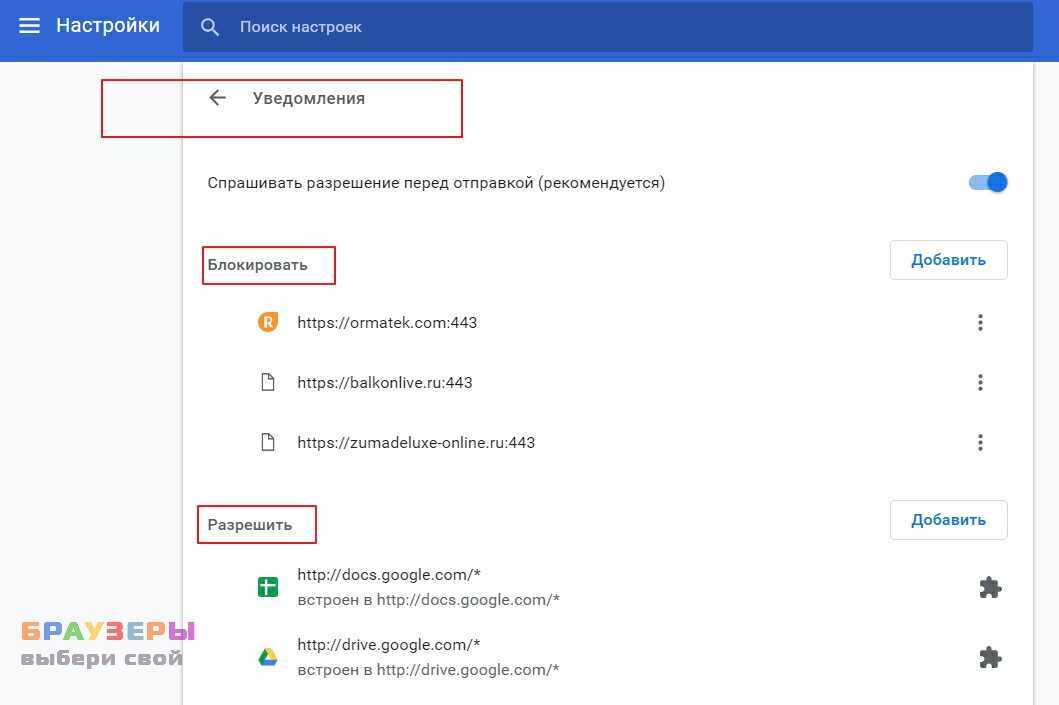 Дальше вы увидите список сайтов в разделе «Блокировать» (здесь сайты которым вы запретили присылать уведомления) и «Разрешить» (сайты, с которых в ваш браузер Хром приходят пуш-уведомления). Чтобы отключить уведомление с сайта (или сайтов), удалите их из списка «Разрешить». Или переместите их в список «Блокировать».