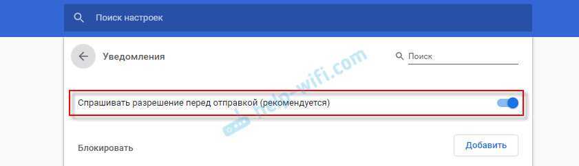 Чтобы вообще не видеть запрос на подписку (отправку уведомлений) на сайтах, отключите пункт «Спрашивать разрешение перед отправкой». Если хотите оставить возможность подписываться на пуш-уведомления от сайтов, то не отключайте этот пункт.