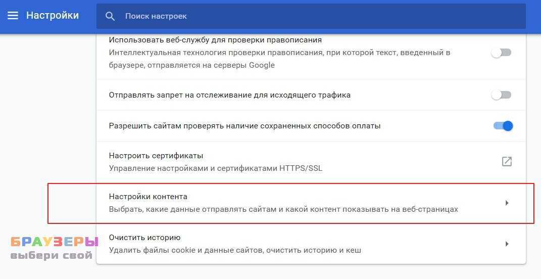 В разделе “Конфиденциальности и безопасность” находим пункт “Настройки контента”:
