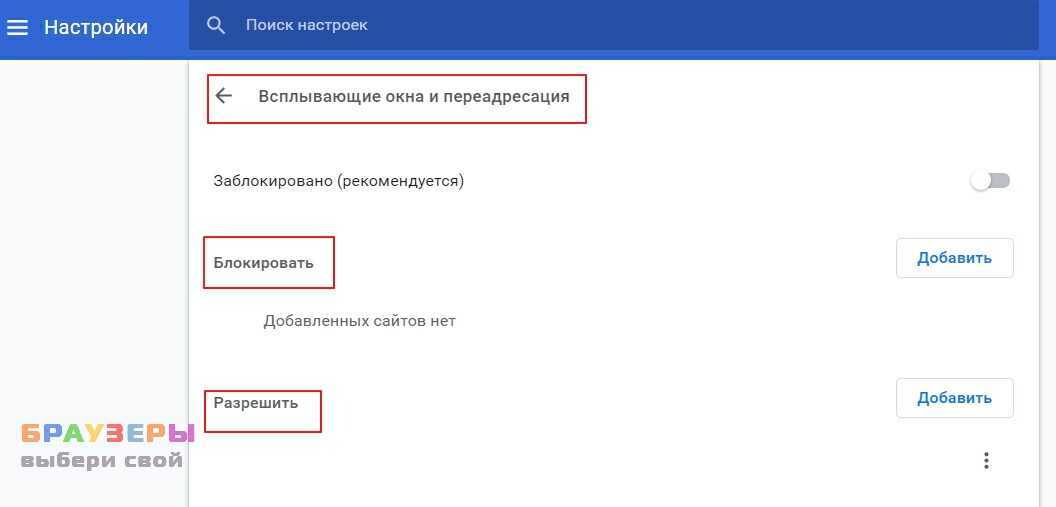 - Найти пункт «Заблокировано» и включить его. Если же вы хотите избавиться от уведомлений только на конкретных ресурсах, выберите «Добавить» в пункте «Блокировать» и добавьте «неугодные» вэб-сайты.Пункт «Разрешить» существует для добавления сайтов, которым можно присылать вам такие уведомления.
