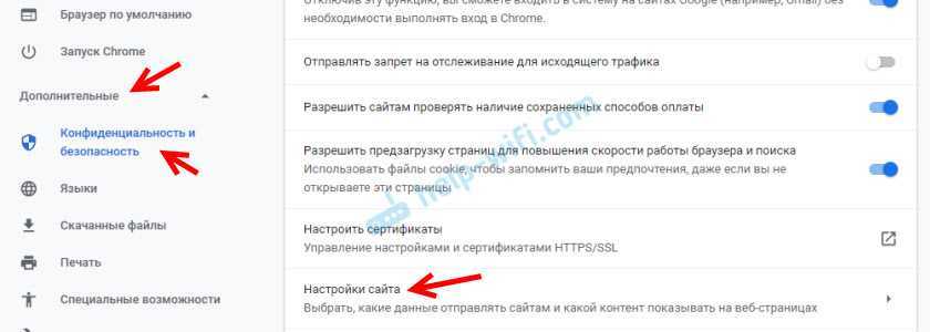 Дальше открыть вкладку «Конфиденциальность и безопасность» и перейти в «Настройки сайта».