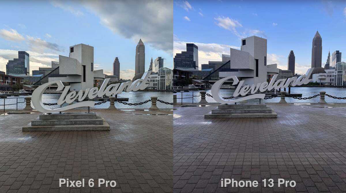 На первый взгляд фото, сделанное на iPhone 13 Pro, выглядит контрастнее и резче. Но если увеличить объекты на заднем фоне, например, здание около причала слева, у Pixel будет больше деталей. Спасибо HDR.