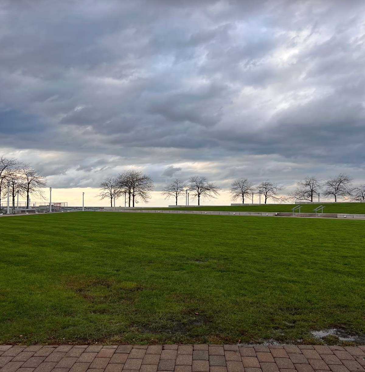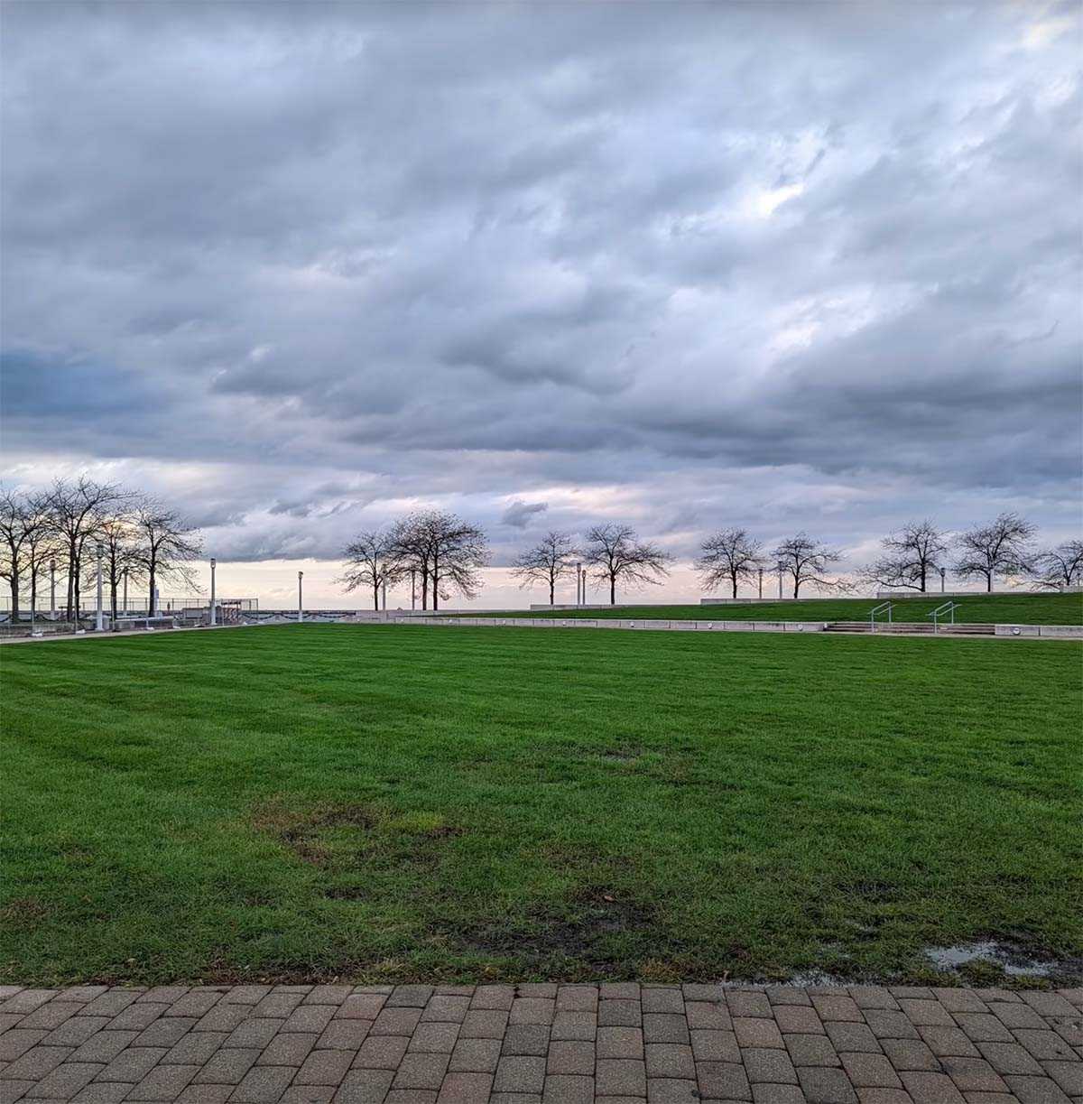 Пейзажный снимок зелёного поля на закате. Ситуация обратная — на Pixel 6 Pro вышел снимок в холодных тонах. iPhone 13 Pro Max смог сделать нейтральную фотографию в тёплых оттенках.