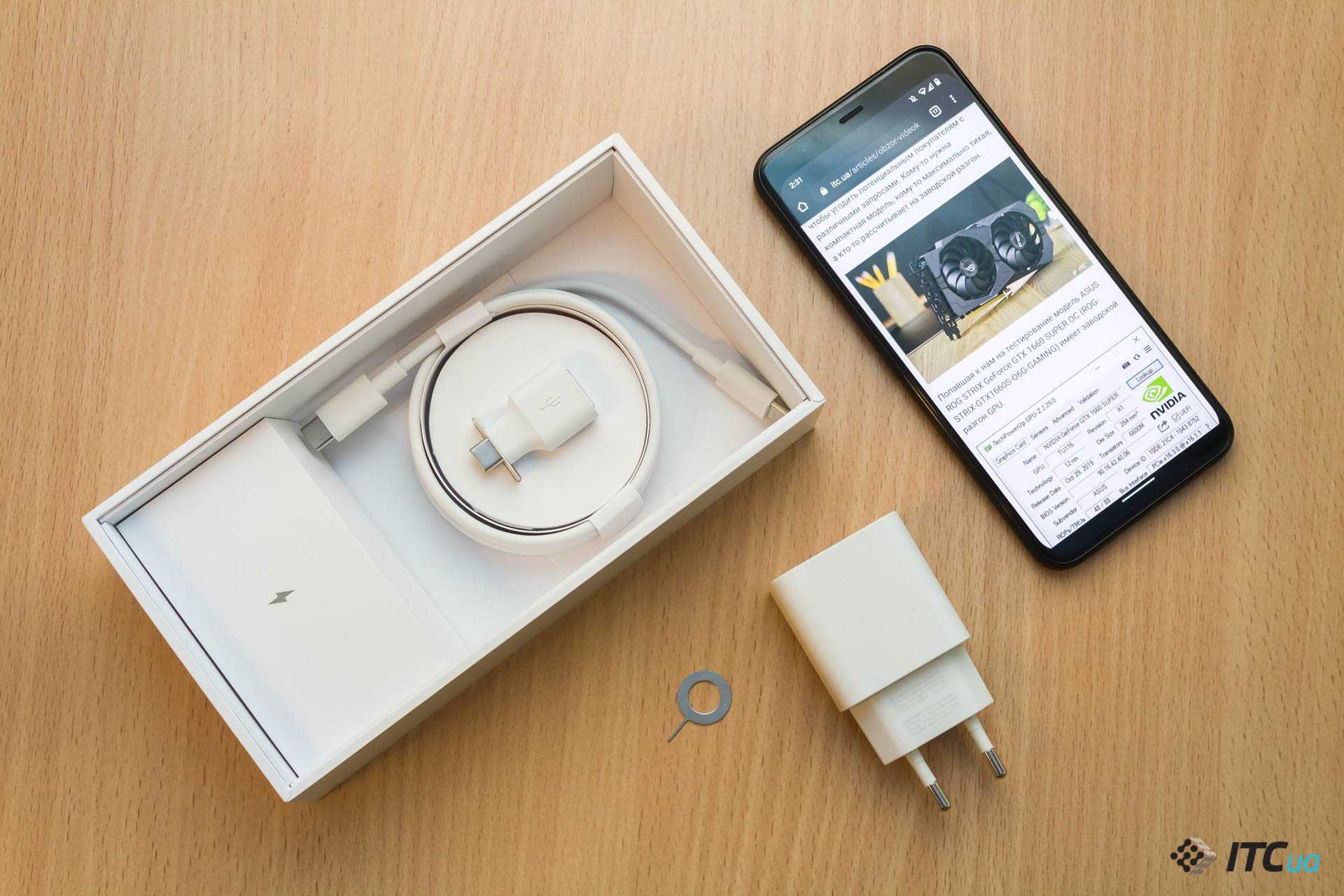Коробка с телефоном довольно симпатична, но внутри нее, если не скудный, то довольно аскетичный набор. Кроме самого устройства, есть кабель, документация, «скрепка» и зарядное устройство. Последнее примечательно тем, что его мощность составляет 18 Вт. Это сулит быструю зарядку, что является весьма востребованной и полезной функцией.
