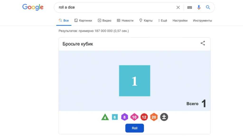 Эта пасхалка может пригодиться для каких-то игр или розыгрышей. Google предлагает пользователям шесть костей с разным количеством граней. Комбинировать их можно по своему усмотрению. Чтобы воспользоваться игровыми костями введите в поиск «roll a dice».
