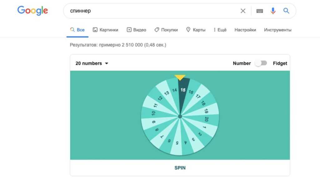 Можно воспользоваться еще одним генератором случайных чисел – рулеткой. По запросу «спиннер» сначала на экране появится детская игрушка. Чтобы поменять ее на рулетку в верхнем правом углу передвиньте ползунок на «number». Генерирование может быть только до 20.