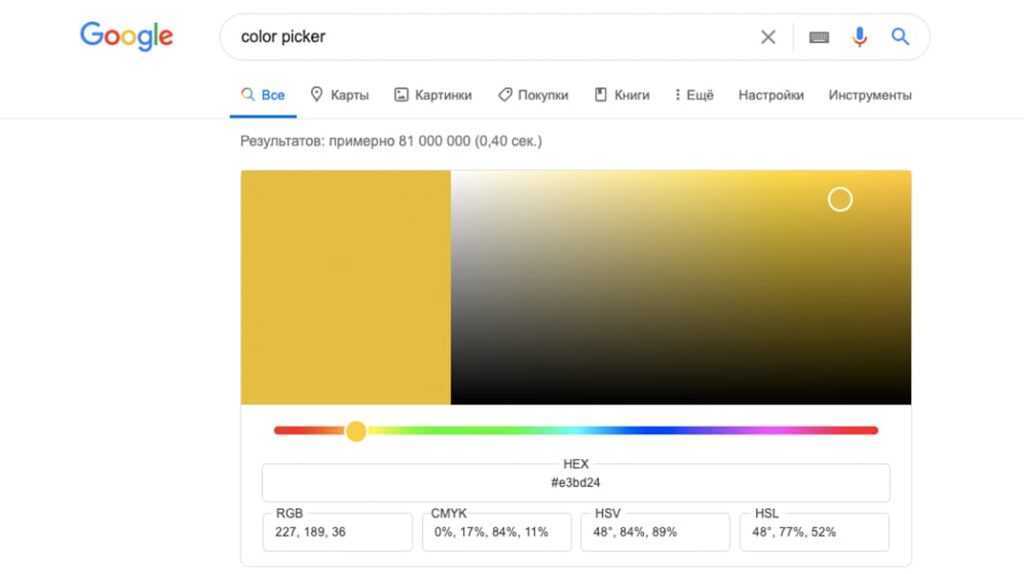 Очень полезный инструмент, который можно открыть при помощи запроса «color picker». В цветовой палитре от Google отображаются параметры выбранного цвета в различных цветовых пространствах.