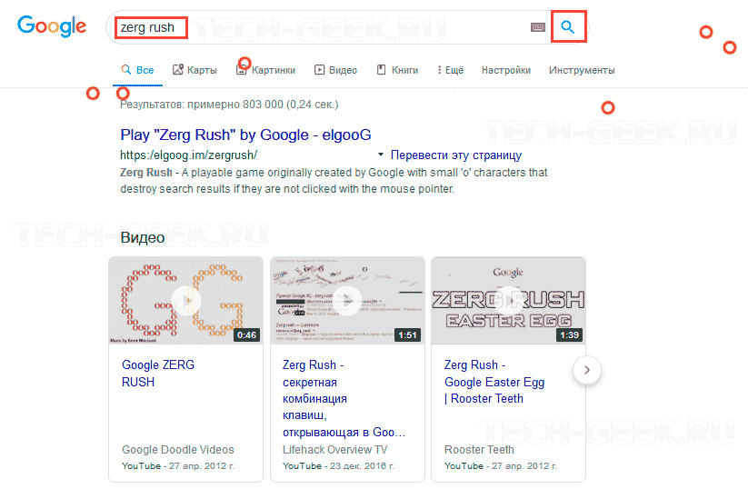 Это скрытая игра, названная в честь стратегии атаки в игре StarCraft 1998 года. Чтобы начать игры, введите «Zerg rush» в Google Search и нажмете Enter, рой букв «O» начнет атаку на результаты вашего поиска. Уничтожайте «O», кликая по ним, чтобы сохранить результаты своего поиска! Эта увлекательная скрытая игра от Google наверняка убьет ваше время.