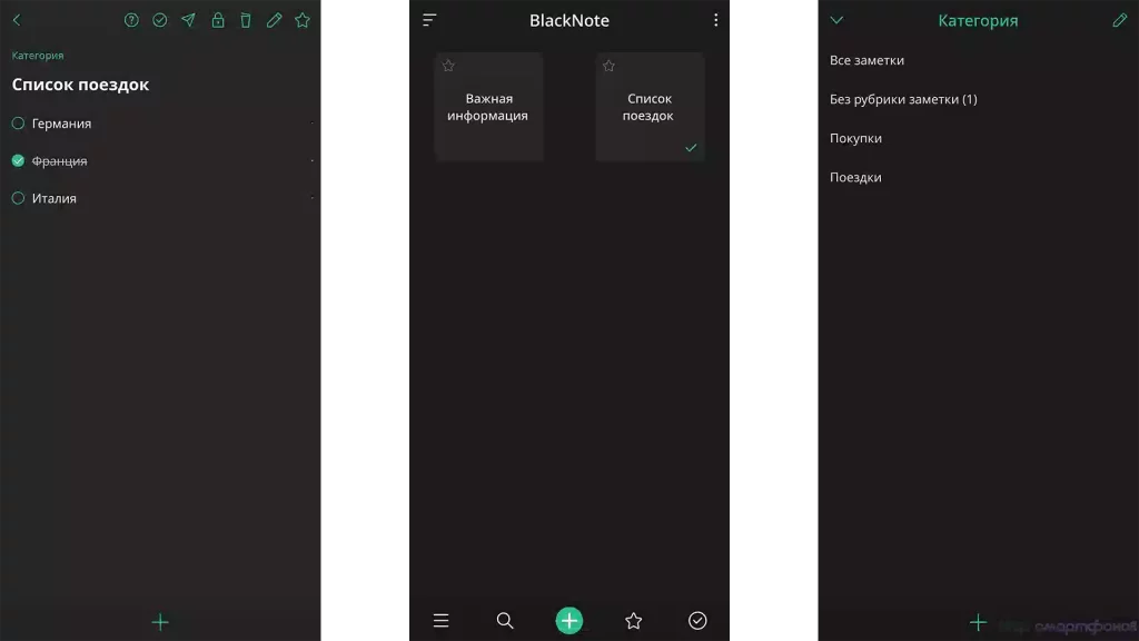 Блокнот для осуществления текстовых записей на смартфонах выделяется на фоне других приложений лаконичным дизайном. Его дизайн сконцентрирован на черных оттенках и минимализме. Поэтому он удобен в использовании, а внутри рабочей зоны ничего не отвлекает от взаимодействия с сохраненной информацией. Записывать в BlackNote допускается простым текстом либо списками. При этом на каждое примечание устанавливается категория для большего удобства в дальнейшей работе. Также можно отмечать отдельные элементы для добавления к «Избранным».