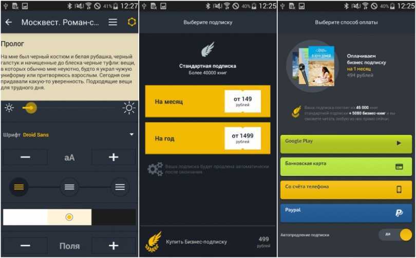 Приложение с рекламой и бесплатным доступом. Есть отдельные программы для чтения книг определенного жанра. В коллекции преимущественно бестселлеры. Стабильность работы сервиса не слишком высока.