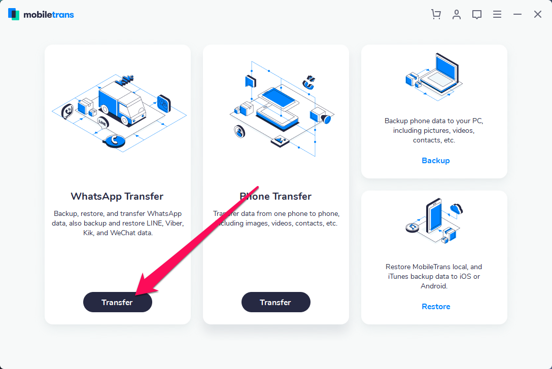 Шаг 1. Загрузите программу WhatsApp Transfer для ПК на Windows или Mac, запустите ее и в окне утилиты выберите опцию WhatsApp Transfer. Перевода на русский язык в приложении нет, но он фактически и не нужен, так как от пользователя требуется нажать буквально несколько кнопок.