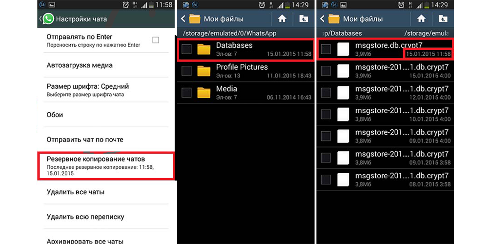 При локальном копировании файлов используется карта памяти или непосредственно сам телефон. Во многих современных смартфонах предусмотрена функция автоматического резервного копирования данных. По умолчанию она включается каждый день в 2 ч ночи. Просмотреть сохраненную базу можно в папках с названиями Whatsapp Images, Whatsapp Animated Gifts, Whatsapp Video.