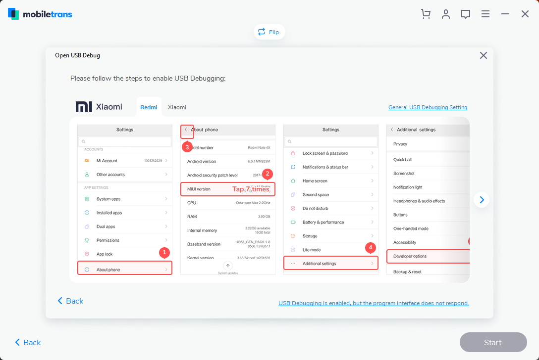 Если для определения смартфона компьютером требуются какие-либо дополнительные действия, то утилита оповестит об этом. Например, в нашем случае программа подсказала, что на смартфоне Xiaomi необходимо включить настройки разработчика и разрешить установку приложений по USB. Это нужно для того, чтобы утилита получила доступ к загрузке данных из мессенджера WhatsApp. На iPhone никаких дополнительных настроек делать не пришлось.