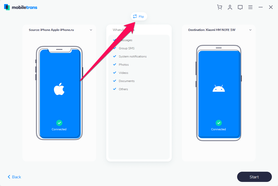 Когда оба смартфона будут определены в программе, важно убедиться, что слева находится устройство, с которого необходимо скопировать данные WhatsApp. Если этот смартфон, наоборот, расположен справа, нажмите кнопку Flip