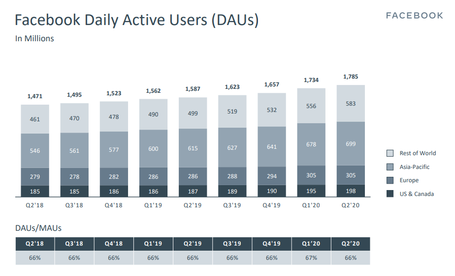 Глобальная аудитория Facebook, по данным на конец второго квартала 2020 года, составляет почти треть населения Земли — около 2,7 млрд активных пользователей в месяц, что на 11% больше, чем годом ранее. Количество ежедневно активных в июне этого года составило 1,785 млрд пользователей (+11% год-к-году).