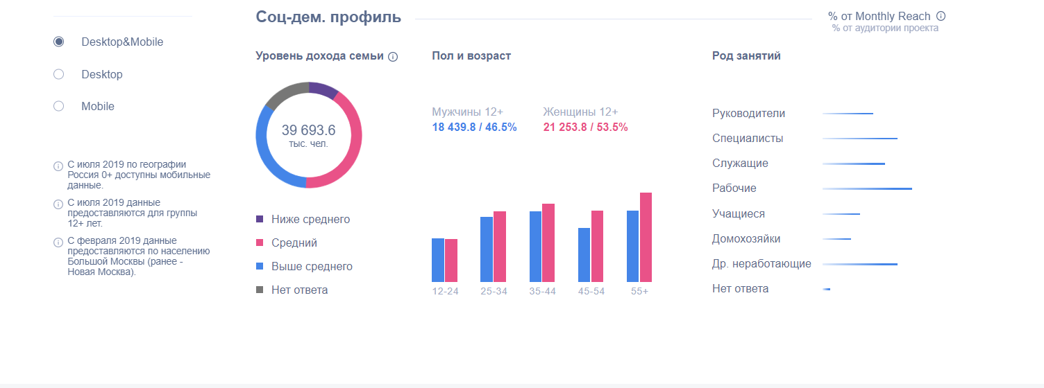 Распределение женщин и мужчин — 53,5% против 46,5%. Меньше всего подростков и молодых людей до 24 лет. Аудитория в основном платежеспособная. Больше всего тех, у кого средний доход (41% от ежемесячного охвата), далее — пользователи с доходом выше среднего (36,7%).