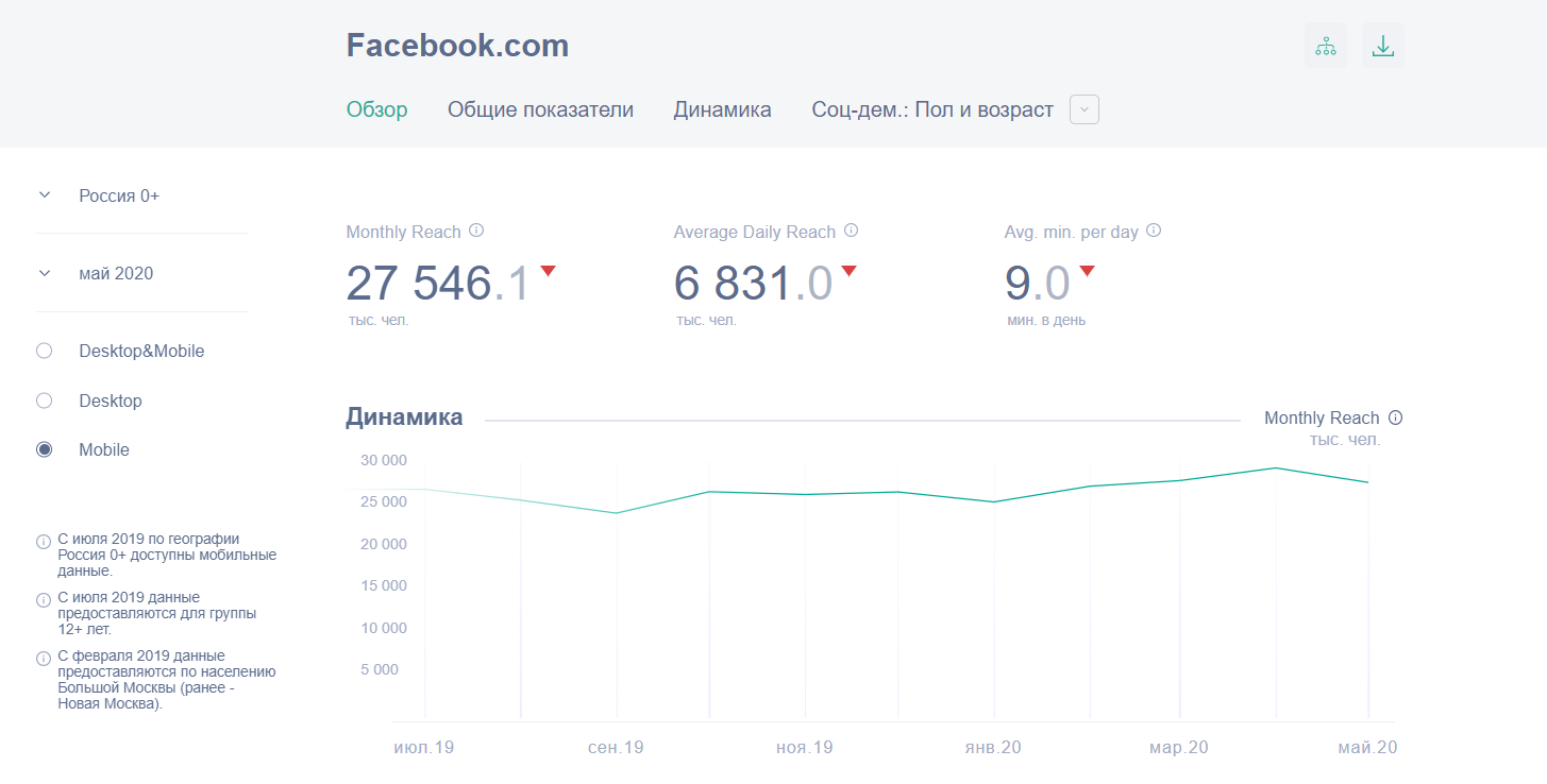 По данным за май 2020 года, около 27,5 млн пользователей в России заходят на Facebook с мобильных устройств.