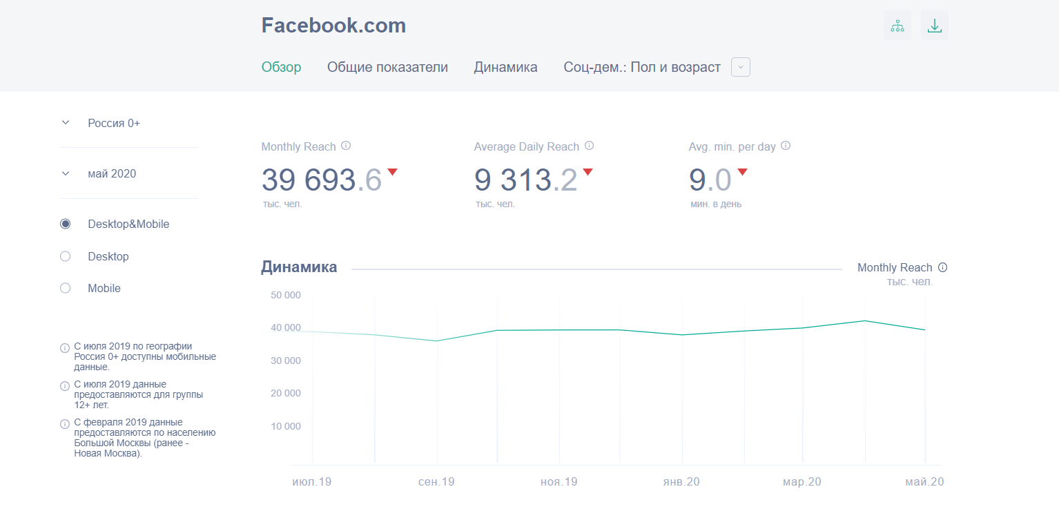Несмотря на столь значительные показатели по миру, в России Facebook не входит в топ-10 ресурсов по версии Mediascope. Каждый месяц в соцсеть заходят около 39,7 млн россиян, по данным на май 2020-го (+1% год-к-году), а количество активных пользователей в день составило около 9,3 млн. В среднем пользователь проводит около 9 минут в сутки на Facebook.