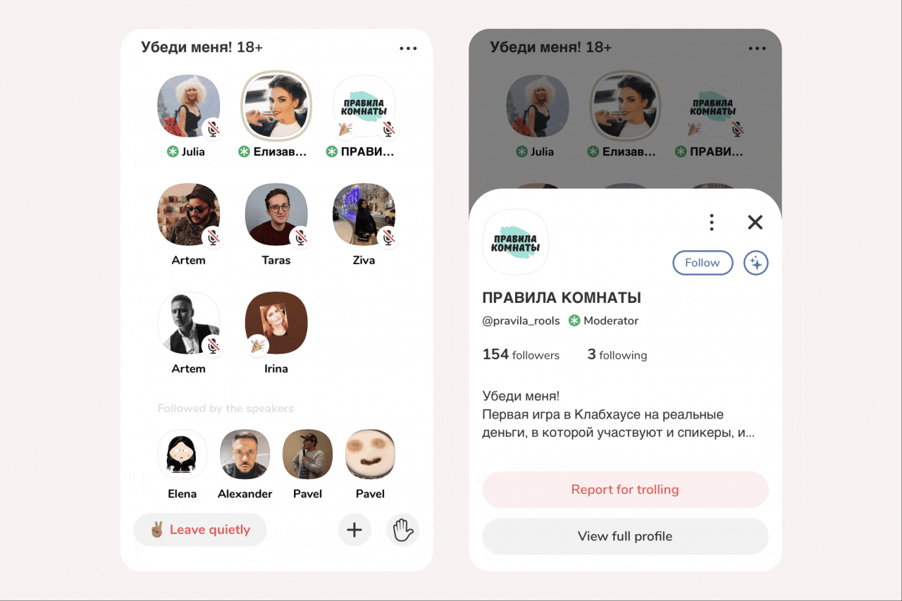 Заходя в комнату для бесед, каждый сначала становится простым наблюдателем. Чтобы вступить в беседу, потребуется «поднять руку», нажав соответствующую кнопку и дождаться, когда модератор рума одобрит запрос. Только тогда включится микрофон и человек сможет вступать в диалоги.