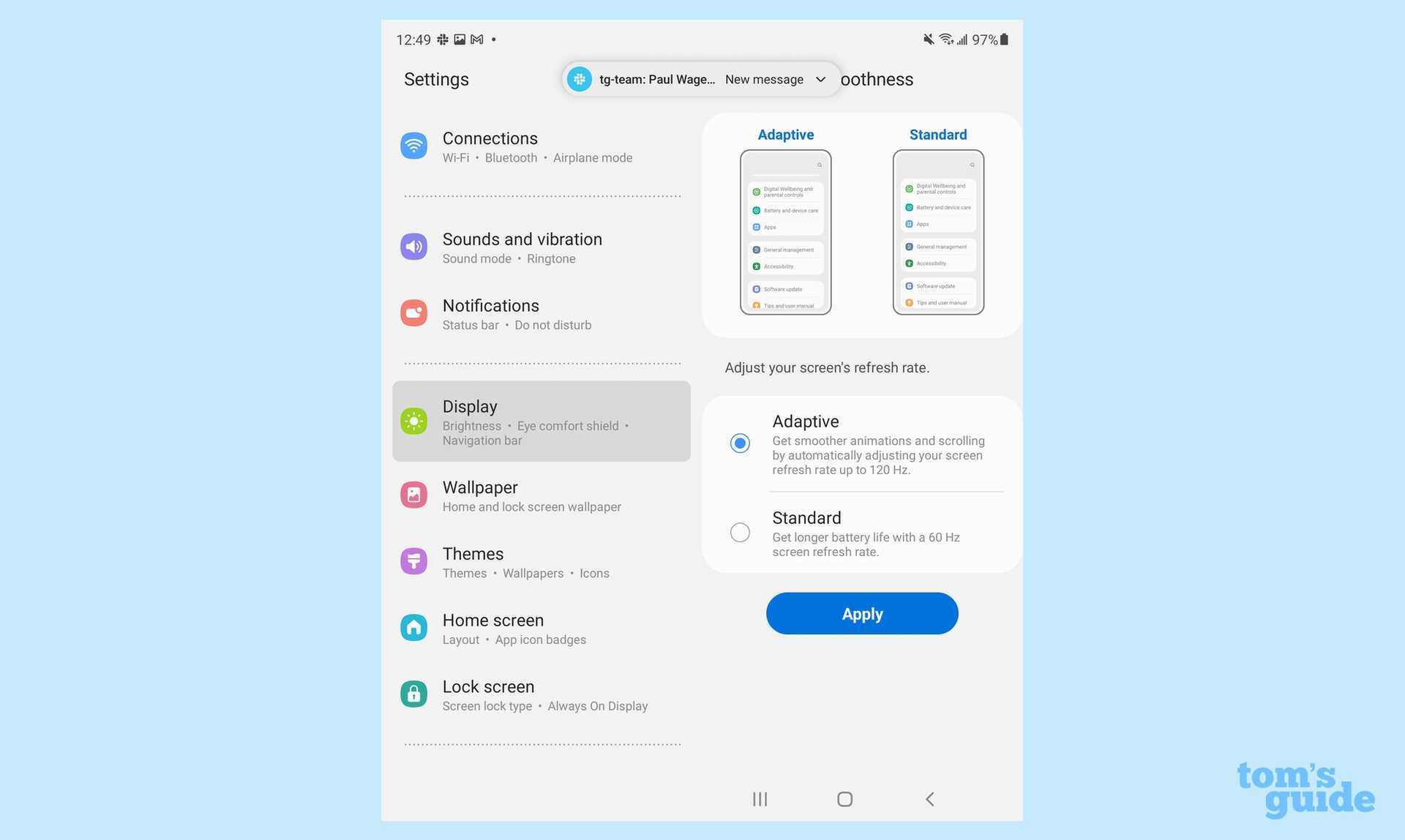 Мы рекомендуем оставить включенной функцию адаптивного дисплея, поскольку более плавная прокрутка делает Galaxy Z Fold 3 намного удобнее в использовании. Но если в какой-то момент вы хотите увеличить время автономной работы, вы можете настроить отображение, запустив «Настройки» и выбрав «Экран». Оттуда выберите «Плавность движения» и выберите «Адаптивная» или «Стандартная».