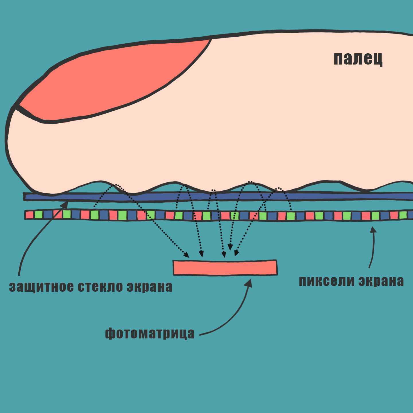 Тут всё просто: это, по сути, чёрно-белая камера, расположенная под матрицей дисплея. Такие сканеры работают исключительно с AMOLED-экранами, где каждый пиксель реагирует на поступаемый в него ток. С IPS-экранами такая штука не прокатит, поскольку матрица просто засветит сканер и вместо фото отпечатка будет чёрное пятно.