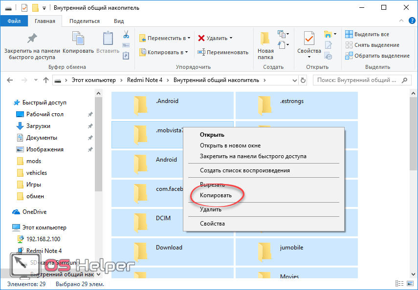 - Откройте внутреннюю память и карту памяти нашего телефона, выделите все их содержимое и копируйте его.