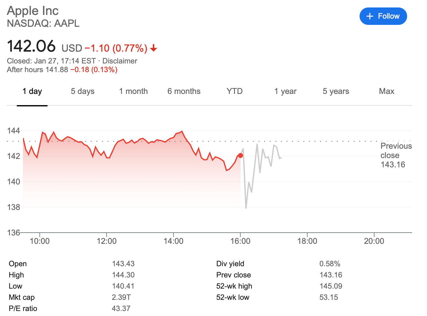 Несмотря на рекордные результаты, ценные бумаги компании не сильно отреагировали на новый финансовый отчет. Курс акций Apple на предварительных торгах немного вырос, затем упал, но в целом остался в границах с 25 по 27 января, в районе 140 долларов. Никаких серьезных взлетов или падений замечено не было.