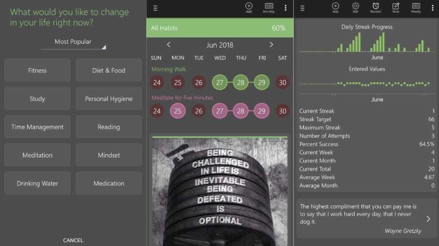 Приложение для отслеживания привычек в сочетании с популярным приложением Alarm может стать идеальной комбинацией для начала работы для достижения вашей цели. Habit Tracker — это универсальное приложение для отслеживания целей для Android, в котором вы устанавливаете индивидуальные цели. Например, сегодня будет удачным днем, когда я ем яблоки (хотя бы / точно / не более) два раза в день.