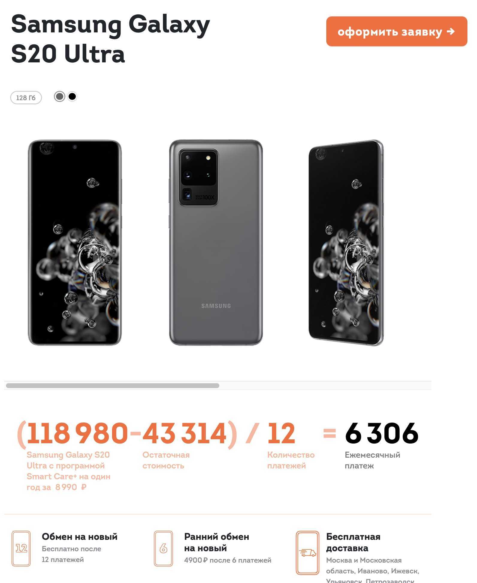Смартфон Samsung Galaxy S20 стоит 69 990 рублей (или 5833 рубля в месяц в течение года). По программе Samsung Upgrade за эту же модель пользователь заплатит 33 595 рублей за год (или 3549 рублей в месяц), то есть более чем в два раза меньше. Остаточная стоимость — 36 395 рублей. Далее у клиента выбор — сдать аппарат обратно и получить следующее поколение или же выкупить его.