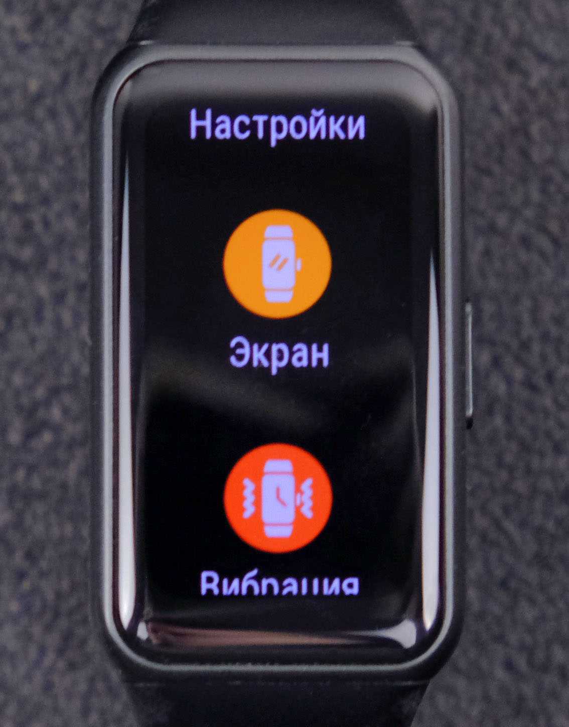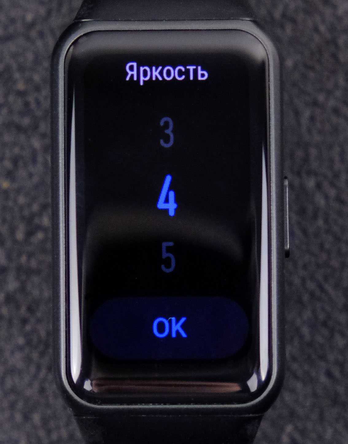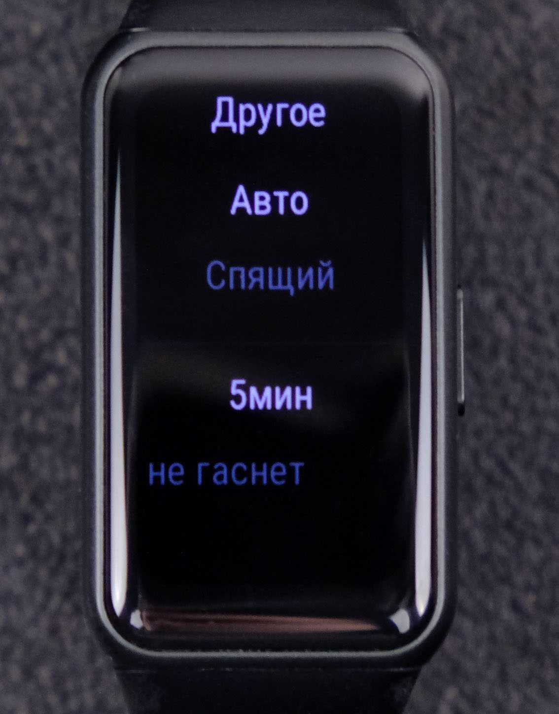 Дисплей имеет скруглённые края 2.5D и отличное олеофобное покрытие – следы от пальцев практически не остаются. Яркость регулируется. Доступно 5 уровней, на максимальном браслет можно использовать в солнечную погоду без особых проблем, читаемость хорошая. Режим подсветки можно также установить в авто – экран загорается при жесте, спящий – только при активации, или поставить время ожидания – от 5 до 20 минут.