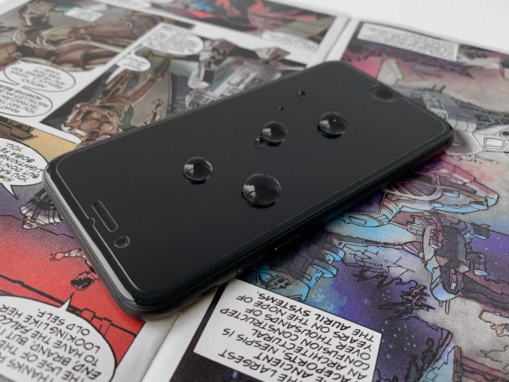 При наличии олеофобного покрытия жидкость не начнёт растекаться по экрану, а аккуратно сформируется в капли. Попробуйте собрать всё воду с дисплея в одно место, воспользовавшись упомянутой ранее пластиковой карточкой. Если жидкость послушно скатывается в каплю, то значит на дисплее имеется защитный слой. Таким простым тестом ещё можно понять, стёрлась нанесённая на заводе плёнка или нет.
