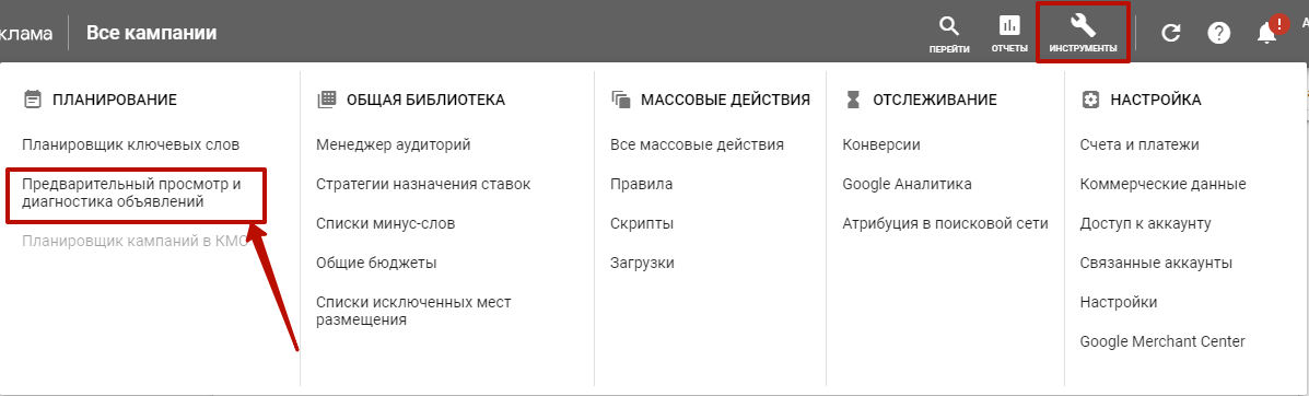 Чтобы им воспользоваться, перейдите на вкладку «Инструменты» и выберите «Предварительный просмотр и диагностика объявлений».